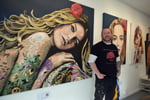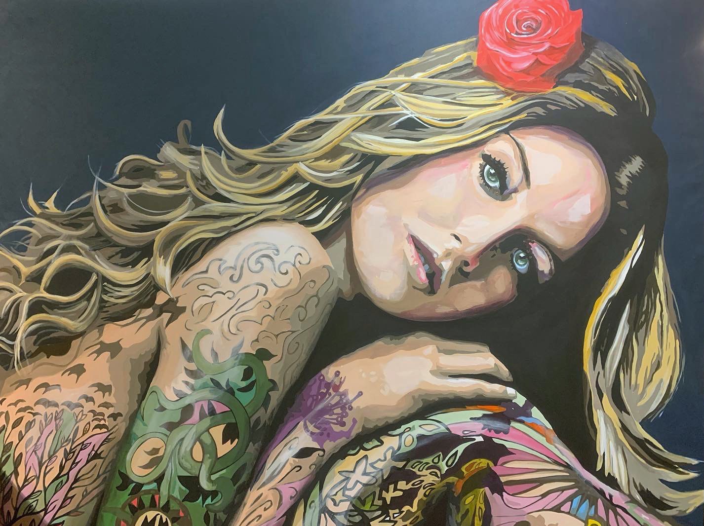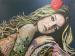 This painting was produced as a one off original with the aim of capturing Gisele covered in colorful tattoos.